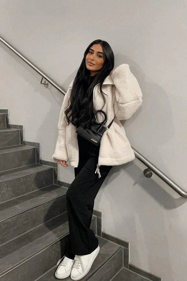 Den bløde teddy-fleece omslutter kroppen og giver en eksklusiv fornemmelse på kølige dage, mens den halvlange silhuet og den stående krave udstråler moderne raffinement.
