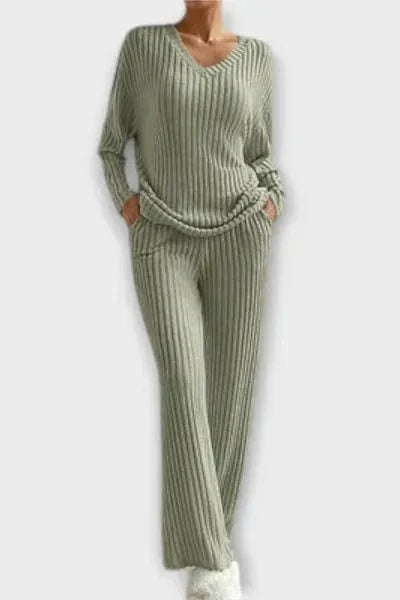 Malou | Ribstrikket sæt forener nordisk håndværk med en diskret luksuriøs æstetik. Sættet består af en ribstrikket top med lang V-udskæring og brede bukser, begge udført i materialer af høj kvalitet og med omhu i hver søm. Designet fremhæver taljen og en feminin silhuet, samtidig med at komforten tillader fri bevægelse. Med fokus på provenance og tidsløs værdi signalerer Malou en samlerstatus. Den begrænsede tilgængelighed gør sættet til et varigt statement, der kan gå i arv gennem sæsoner. Brug det som et elegant basislag eller som en fuldendt kreation, der udstråler raffinement uden at skjule håndværksmæssige detaljer.
