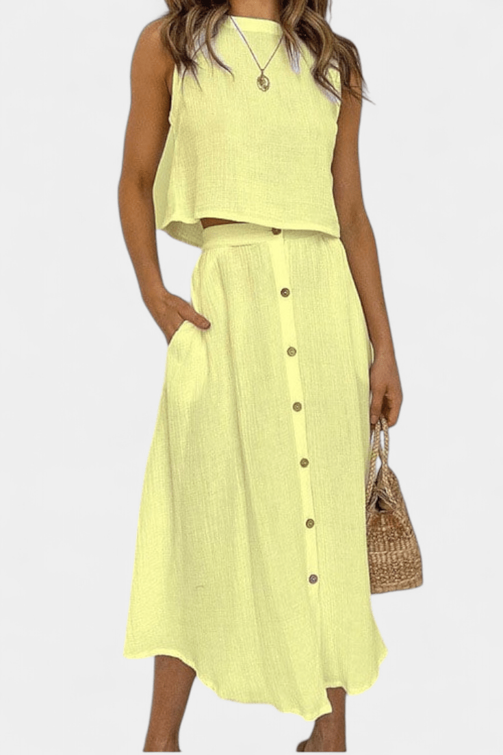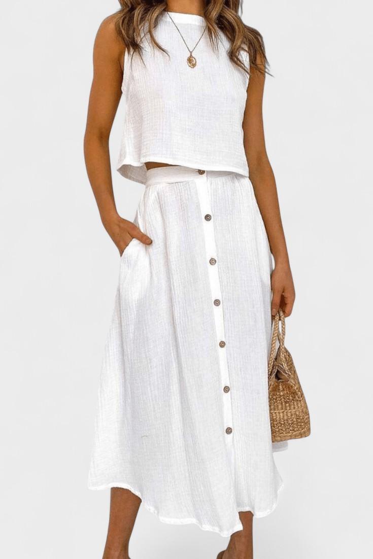 Maja | Blødt sæt udstråler diskret luksus og tidløs kvalitet gennem en minimalistisk, håndværksmæssigt overvejet tilgang. Det lette bomuldsmateriale føles blødt mod huden, og den åndbare pasform sikrer komfort hele dagen. Den centralt placerede knaplukning skaber illusionen af en længere silhuet, mens det rene, ærmeløse snit tilfører moderne lethed. Nederdelen i midi-længde med funktionelle lommer og luftig lægning bevæger sig med dig og giver sættet en naturlig alsidighed til hverdagen eller byens sofistikerede øjeblikke. Produceret i et begrænset oplag giver Maja en diskret eksklusivitet og samlerappel.