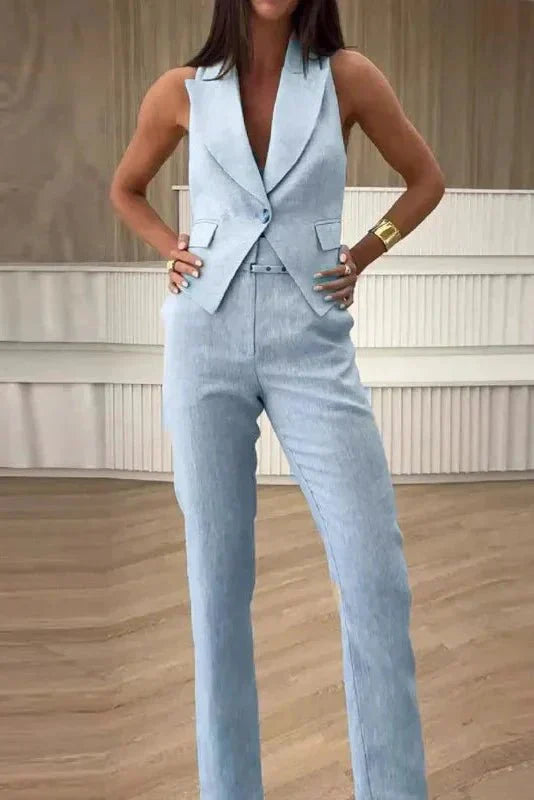 Inger | Sæt står som en hyldest til kompromisløst håndværk og tidløs elegance. Dragten kombinerer en ærmerfri vest og smalle bukser, der skaber en slank, lige silhuet med et moderne præg, som følger dig fra mødelokalet til aftenarrangementet. Det lette, rynkefri stof sikrer behagelig komfort hele dagen, mens det skarpe, lige snit forlænger kroppen og giver et raffineret udtryk. Tilgængelig i beige, blød lyserød og pudderblå signalerer Inger | Sæt personlighed uden at gå på kompromis med en ren konstruktion. I et begrænset antal hos udvalgte forhandlere står Inger som bevis på ægte håndværk og arv – en investering i tidløs elegance og selvtillid ved alle lejligheder.