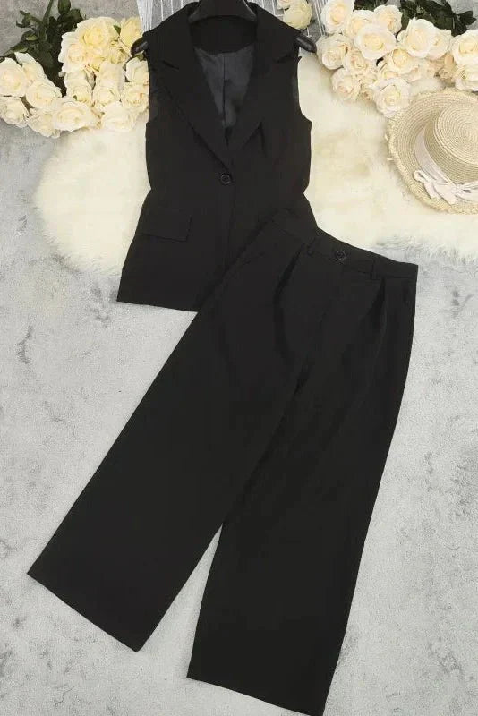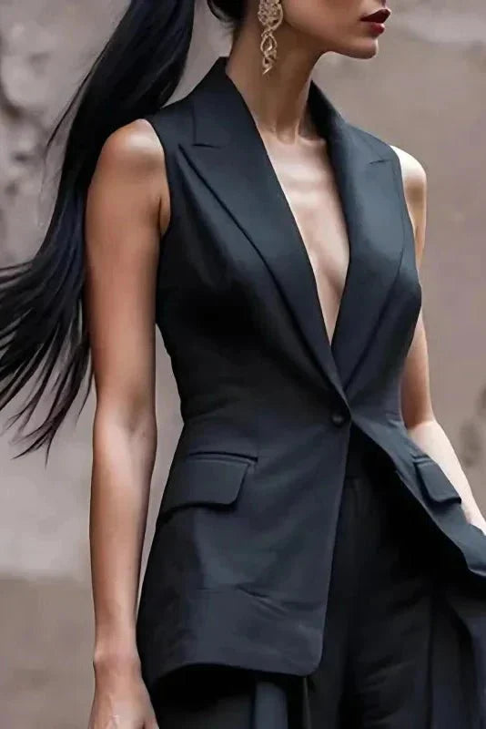 Maja | Luksuriøst sæt Ravenna Kostume markerer kulminationen af håndværk og arv. Den skarpt skårne, ærmeløse vest sammen med brede bukser skaber en silhuet, der er både moderne og tidløs, i en dyb sort nuance, der udstråler diskret elegance. Det strukturerede, åndbare stof sikrer en præcis pasform og komfort hele dagen, mens materialernes kvalitet og håndværk afspejler lang levetid og vedvarende værdi. Som en eksklusiv limited edition står Ravenna-kostumen som en ægte samlergenstand, der tilfører garderoben tidløs kvalitet og alsidig appel til kontor, middage og aftener. Den sofistikerede skræddersyede vest fremhæver taljen og balancerer det brede bukseudtryk og understreger sætets moderne, tidsløse følelse.